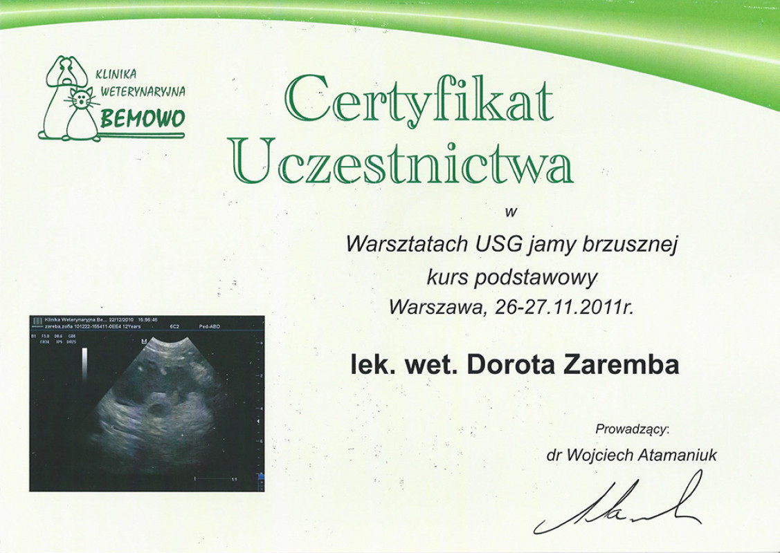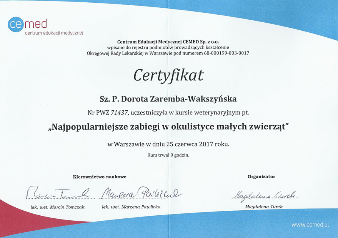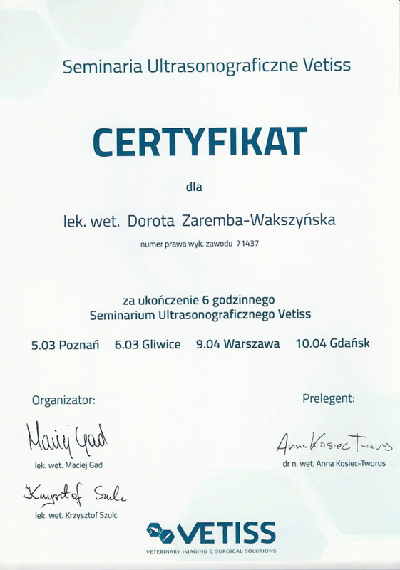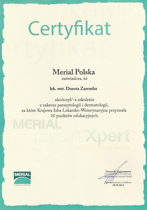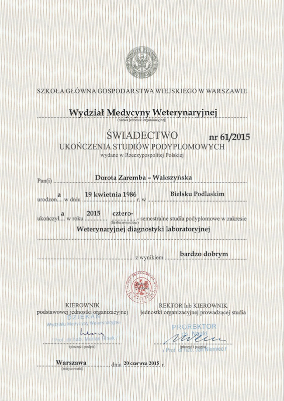 Chcąc ciągle podnosić swoje kwalifikacje, ukończyłam Specjalizacyjne Studia Podyplomowe uzyskując tym samym tytuł Specjalisty Weterynaryjnej Diagnostyki Laboratoryjnej. Pracowałam też w jednym z większych podwarszawskich laboratoriów weterynaryjnych.